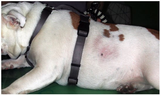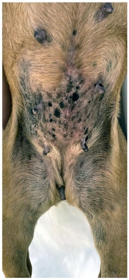 This viral skin disease associated with Chipapillomavirus is reported in many brachycephalic breeds, including the Pug, French bulldog, Chihuahua, and Boston Terrier, as well as in non-brachycephalic breeds [65,66,67,68]. The onset of the disease may be related to a genetic immunodeficiency, as reported in pugs, Vizslas, and Chihuahuas, or secondary to immunosuppression [164]. Numerous small, plaque-like, hyperpigmented lesions with an irregular and scaly surface appear on the ventral neck, thorax, abdomen, and ventro-medial, proximal limbs (Figure 4). A progression to wart-like lesions is described [164]. Depending on the location and number of lesions, discomfort and pruritus can occur [164]. Lesions further progress, especially at the beginning, and rarely transform into squamous cell carcinoma [165]. The clinical appearance together with histopathology often allow a diagnosis, but in the early stages of the disease, further workup, such as PCR, may be needed [166]. Several treatment options are described, including surgical removal, laser treatment, cryotherapy, systemic azithromycin, interferons, and retinoids, as well as topical agents such as vitamin A, imiquimod, or tigilanol tiglate gel [164,166].