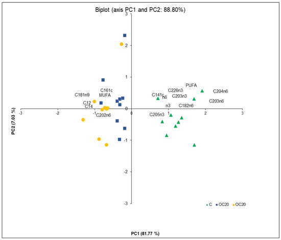 Principal component analysis was applied to fatty acids detected in meat samples from concentrate (C), concentrate with the inclusion of silage cake at 20% (OC20) and concentrate with the inclusion of silage cake at 40% (OC40) diets. Scores and loading plots on the first two principal components. Scores correspond to samples, and loadings correspond to variables.