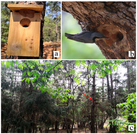 - Zhang, L.; Bai, L.M.; Wang, J.; Wan, D.M.; Liang, W. Occupation rates of artificial nest boxes by secondary cavity-nesting birds: The influence of nest site characteristics. J. Nat. Conserv. 2021, 63, 12605. [Google Scholar]