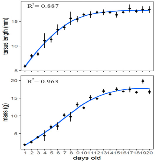 - Martin, T.E.; Llyod, P.; Bosque, C.; Barton, D.C.; Biancucci, A.L.; Cheng, Y.-R.; Ton, R. Growth rate variation among passerine species in tropical and temperate sites: An antagonistic interaction between parental food provisioning and nest predation risk. Evolution 2011, 65, 1607–1622. [Google Scholar] [CrossRef]