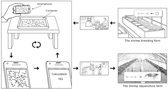 Aquatic food is a primary source of protein for human consumption, with China currently leading the world in the production, exportation, and processing of aquatic products. China’s share of global aquaculture production is approximately 57% []. The production of the Penaeus monodon species of shrimp has seen a remarkable increase and reached 104,665 tons in 2021 []. The breeding of Penaeus monodon requires advanced technology and strict environmental conditions. As a result, shrimp larvae hatching is typically carried out in specialized hatcheries with experienced professionals and dedicated facilities. Farmers purchase shrimp larvae from these hatcheries to continue their aquaculture operations. Estimating the number of larvae, however, remains a challenging and time-consuming task in larvae trading. Penaeus monodon larvae have high value but are also relatively fragile and unable to withstand dehydration for extended periods. Prolonged hypoxia can result in the death of larvae []. Therefore, shrimp larvae cannot be weighed for estimation, and the quantity must be used as a proxy for the value of the larvae. Nevertheless, the small size of the larvae and their large numbers in transactions make manual counting a labor-intensive process, taking an average of 15–20 min to count 500–700 shrimp larvae []. There is an imminent need for an accurate and efficient method for counting shrimp larvae.