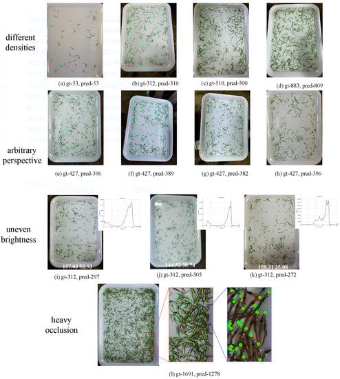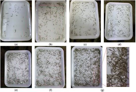 Figure 2 shows some images in the dataset. There is a light reflection in Figure 2a,c,e and uneven light intensity in Figure 2a–g, which result in differences in image brightness. Figure 2g belongs to an additional image group added to the test set that is not in the training set. It tests the performance of the model under extremely dense larvae. There are approximately 1691 larvae in the image, and there is a serious overlap between shrimp larvae, which is quite challenging and meaningful for testing. In addition, the images are obtained from an arbitrary perspective and contain a varying number of larvae, which is similar to the complex and arbitrary usage scenarios.