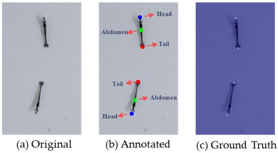 The original, annotated, and ground truth images. We annotated three kinds of keypoints on each larva: head, abdomen, and tail. The head and tail are regarded as the same kind of keypoint to generate the ground truth.