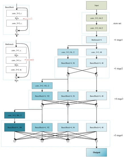 We use HRNet-w48 as the feature extraction module, as shown in Figure 5, and the network configuration follows HRNet-w48. HRNet-w48 consists of four stages, 1, 2, 3, and 4, which contain 1, 1, 4, and 3 exchange blocks, respectively. After each stage is executed, the result of fusing the high-resolution branch with the downsampled result of the low-resolution branch is used as the input for the lowest-resolution branch of the next stage. There are a total of four branches. HRNet completes the fusion of high-dimensional features and low-dimensional features via repeated multi-resolution branch information interaction to produce richer and more accurate results. The higher resolution branch reduces the resolution through a downsampling operation, while the lower resolution branch improves the resolution using the nearest neighbor interpolation upsampling method. In this study, the output of branch 1 with the highest resolution is used as the heatmap of the model output for further localization and counting analysis.