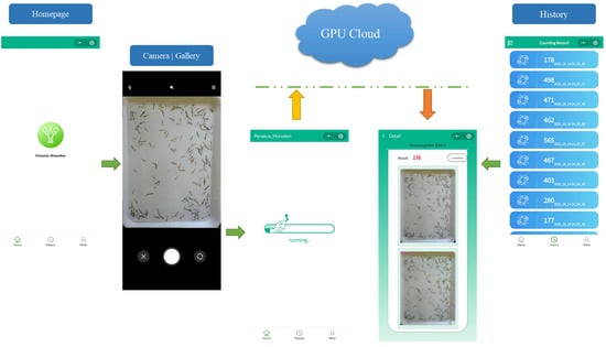 The proposed algorithm for automatically counting shrimp larvae is implemented through a WeChat applet, which offers a concise and convenient user interface. Figure 6 illustrates the usage of the app. On the applet’s homepage, users can click the green count button situated in the middle. They have the option to either capture a photo or select a shrimp larvae image from their smartphone album. Subsequently, the user can upload the image to the cloud server for processing. On the cloud server, the mask R-CNN algorithm is initially employed to extract the image container, thereby eliminating background interference. To enhance the resolution of the images input into the backbone network, the picture is divided into four segments. These segments are then individually sent into the backbone network, and PLCS is applied to the output feature map to obtain the counting results and accurately determine the positioning of the shrimp keypoints. Finally, the shrimp larvae counting results, along with the processing time, original image, and labeled image, are delivered to the result page for display. Each counting result is saved in the counting history for future review.