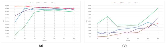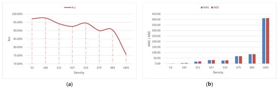 Average performance of the proposed method in eight groups. (a) Accuracies with different densities; (b) MAEs and MSEs with different densities.