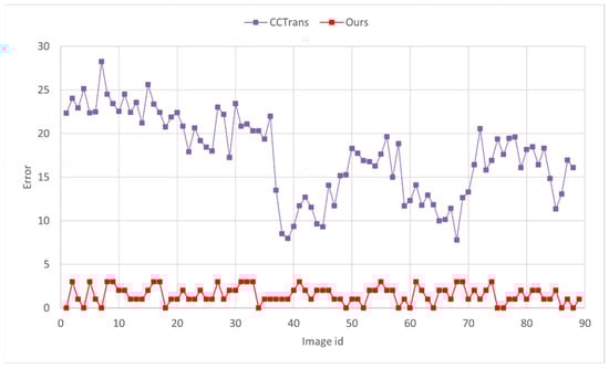 The evaluation metrics used in previous methods [,,,,] on this dataset are different from the metrics proposed in Section 2.2.5, as they primarily focus on metrics related to object detection or instance segmentation. In our study, we utilized a point-based dataset generated from the BBBC041v1 to retrain BLNet, CCTrans, and the proposed method. The only parameter that was adjusted was the Enum parameter of the PLCS algorithm, which was set to 1. All other parameters remained consistent with the ones described in Section 2.2.4. After testing on the test set, we obtained the results presented in Table 7. Our proposed method achieves an accuracy of 82.33% on the test set. Compared to CCTrans, our method improves the accuracy by 0.12%, reduces the MAE by 0.84, and decreases the MSE by 3.04. These results demonstrate that our method not only enhances accuracy but also increases stability, maintaining a high level of performance.