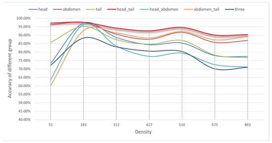 The proposed method is trained with the same parameters as detailed in Section 2.2.4 and evaluated on the test set. Figure 12 illustrates the performance of the seven different keypoint combinations on the test set, while Table 6 presents the average accuracy, MAE, and MSE of these models. The red curve indicates the accuracy of Group 2, and the other colors show the accuracy of the other groups (see the legend for details). Notably, the head–tail keypoint combination outperforms other methods in accuracy at each density level and is also more stable. This result can be attributed to the special slender body shape of the Penaeus larvae. Hence, we employed the head–tail keypoint combination to generate the ground truth for the proposed method.