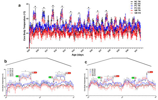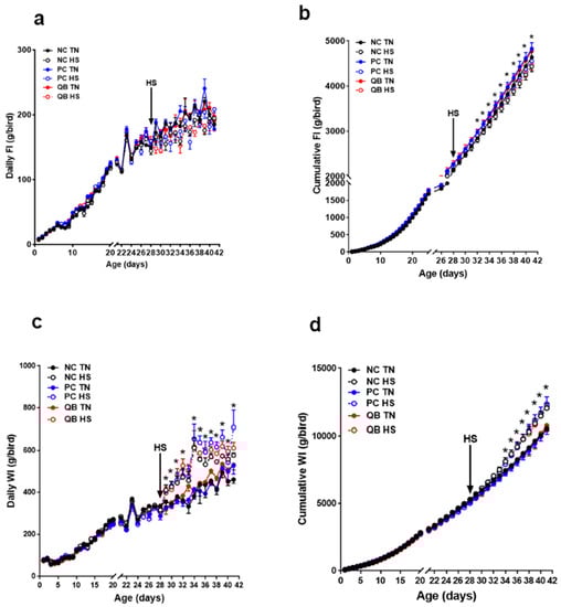 - Ruff, J.; Barros, T.L.; Tellez, G.; Blankenship, J.; Lester, H.; Graham, B.D.; Selby, C.A.M.; Vuong, C.N.; Dridi, S.; Greene, E.S.; et al. Research Note: Evaluation of a heat stress model to induce gastrointestinal leakage in broiler chickens. Poult. Sci. 2020, 99, 1687–1692. [Google Scholar] [CrossRef] [PubMed]