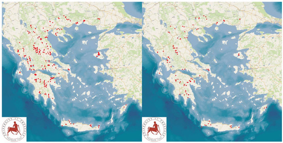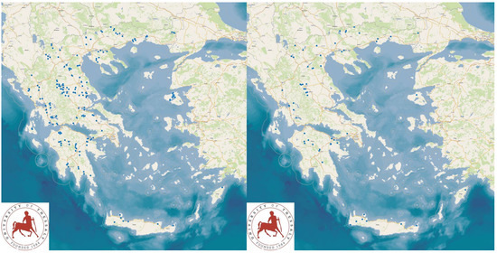 Locations (blue dots) of sheep flocks (left figure) and goat herds (right figure) around Greece, in which machine-milking was practiced.