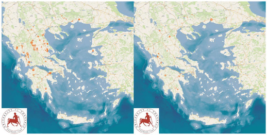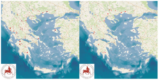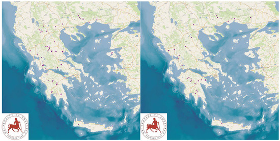 Locations (purple dots) of sheep flocks (left figure) and goat herds (right figure) around Greece, in which total bacterial counts over 1500 × 103 cfu mL−1 in bulk-tank milk were detected.