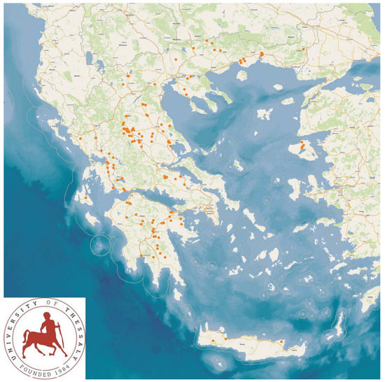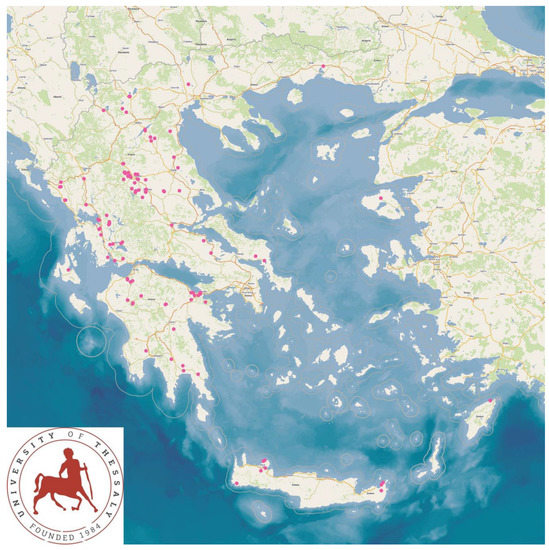 Locations (orange dots) of sheep flocks and goat herds around Greece, in which staphylococci resistant to at least one antibiotic were isolated from bulk-tank milk.