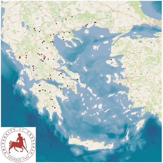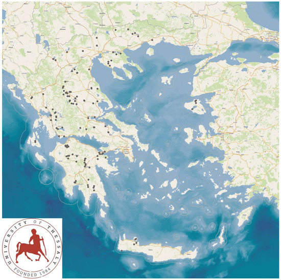 Locations (black dots) of sheep flocks and goat herds around Greece, in which vaccination against staphylococcal mastitis was performed.