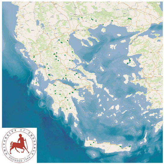 Locations (green dots) of sheep flocks and goat herds around Greece, in which D. dendriticum was detected in pooled faecal samples.