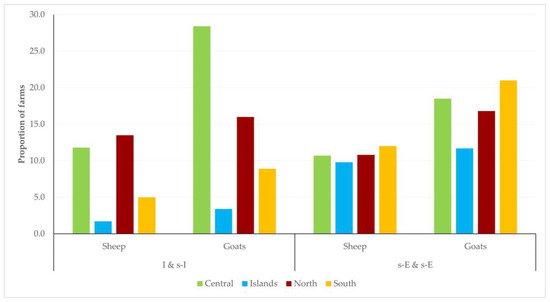 There was clear evidence of significant differences in the distribution of farms in the country in accordance with the management system and the geographical area (p < 0.0001 for sheep flocks and p = 0.010 for goat herds). Most farms managed under the intensive or semi-intensive system were located in the central or north areas of the country, whilst farms managed under the semi-extensive or extensive system were, in general, equally distributed among the four geographical areas (Figure 13, Table S5).