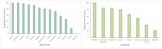 However, and despite the importance of small ruminant farming for Greece, no detailed countrywide mapping of the respective farms has been undertaken and published. Previous papers reported limited information, for example, only regarding specific practices applied in sheep and goat farms or with narrow geographical coverage. For example, previous studies reported information about management practices performed only in farms in some parts of the country (e.g., island of Lesvos: Kizos et al. [7], Peloponnese: Manolopoulou et al. [8], Central Greece: Perucho et al. [9]); other studies reported information only about farms with specific animal breeds (e.g., sheep of the Friesarta breed: Kominakis et al. [10], sheep of the Chios breed: Gelasakis et al. [11]).