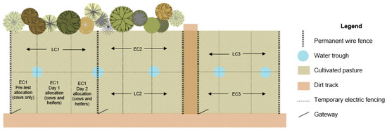 Paddock allocation for experimental groups (not to scale). EC = early calving time replicate; LC = late calving time replicate. Each replicate comprised 3 groups, as illustrated in this figure. The EC1 paddock illustrates in greater detail the three allocations (one for cows only on the day prior to testing and one each for the two testing days for the mixed group of heifers and cows).