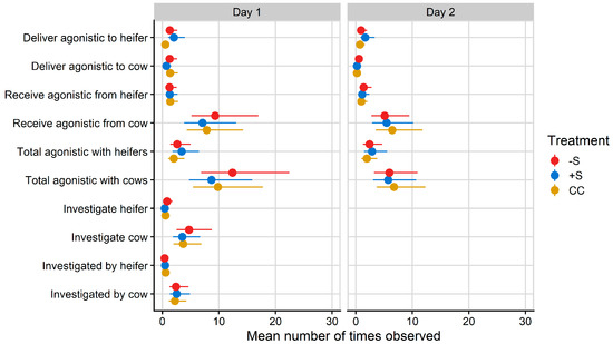 Plot of mean values/hour for social behaviours observed during the hour after mixing on Day 1 and the hour after fresh pasture allocation on Day 2 of integration testing. Total agonistic behaviour encompasses agonistic behaviours received and delivered, as well as mutual aggression (head-to-head fights). Investigative behaviour could not be included for analysis on Day 2 due to its low observance rate. CC = heifers reared commercially in sheds without adult contact; +S = heifers reared at pasture with adult contact; and −S = heifers reared at pasture without adult contact. Symbols denote the treatment mean, while spread denotes values captured within the 95% confidence interval.