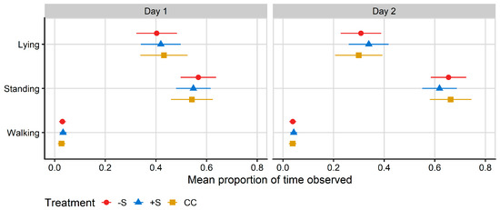 Plot of the mean proportion of time spent in each behaviour recorded by RumiWatch pedometers, per treatment. Data correspond to 24 h after first mixing with a herd of mature cows (Day 1) and 12 h after the mixed group was moved to a fresh allocation of pasture (Day 2). CC = heifers reared commercially in sheds without adult contact; +S = heifers reared at pasture with adult contact; and −S = heifers reared at pasture without adult contact. Symbols denote the treatment mean, while spread denotes values captured within the 95% confidence interval.
