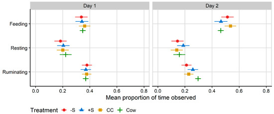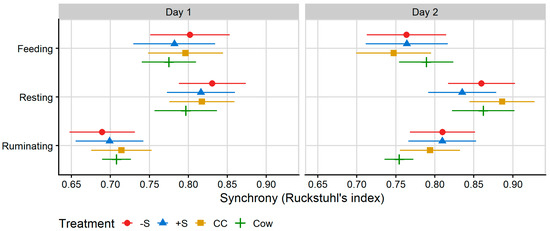 Plot of the mean proportion of time spent in synchrony with other members of the testing group for behaviours collected by MooMonitor+ collars across 24 h on Day 1 and 12 h on Day 2 of integration testing. Synchrony was calculated according to a binary (performing/not performing a behaviour) for each 15-min time interval collected by MooMonitor+ collars according to Ruckstuhl’s index ([32], i.e., a synchrony index calculated from the proportion of total time intervals spent performing the same behaviour as the group mean behaviour over the period of data collection). Data correspond to 24 h after first mixing with a herd of mature cows (Day 1) and 12 h after the mixed group was moved to a fresh allocation of pasture (Day 2). CC = heifers reared commercially in sheds without adult contact; +S = heifers reared at pasture with adult contact; and −S = heifers reared at pasture without adult contact. Cow = resident cows taken from the larger milking herd, housed with heifers at a ratio of two cows: one heifer. Symbols denote the treatment mean, while spread denotes values captured within the 95% confidence interval.