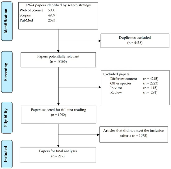 Articles that met all of the following eligibility criteria were included in the database: (1) studies with lactating cows (encompassing different breeds of dairy cows); (2) utilization of both control (without lipid supplementation) and treatment (with lipid supplementation) diets—studies involving ruminal, post ruminal, or intravenous infusions were not included; (3) reports of the treatment means and respective measures of dispersion (standard error (SE), standard error of the mean, standard error of difference, or coefficient of variation); (4) reports of the composition and/or FA profile of the lipid supplements and diets; and (5) publication as full-length articles in indexed journals with a JCR impact factor. Duplicate studies and those failing to meet the eligibility criteria were excluded. A total of 217 peer-reviewed articles were included in this study (Figure 1 and Supplementary Material File S1).