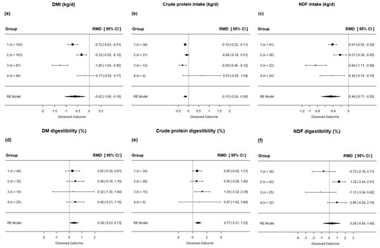 Forest plot of the effect of lipid-supplemented diets on nutrient intake [(a) DMI; (b) crude protein intake; (c) NDF intake] and digestibility [(d) DM; (e) crude protein; (f) NDF] in lactating dairy cows. Diets are grouped by fatty acid profile. The square represents the mean effect size of lipid source group and square size represents the relative weight of the lipid source group to the overall effect size. The lines connected to the squares represent the lower and upper 95% CI for the effect size. The diamond is the overall effect size with a 95% CI. The dotted vertical line represents a mean difference of zero (i.e., no effect), while negative or positive values denote the effect of the lipid source group.