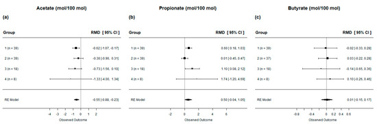 Forest plot of the effect of lipid-supplemented diets on rumen parameters in lactating dairy cows. Diets are grouped by fatty acid profile. [(a) acetate; (b) propionate; (c) butyrate]. The square represents the mean effect size of lipid source group and square size represents the relative weight of the lipid source group in the overall effect size. The lines connected to the squares represent the lower and upper 95% CI for the effect size. The diamond is the overall effect size with a 95% CI. The dotted vertical line represents a mean difference of zero (i.e., no effect), while negative or positive values denote the effect of the lipid source group.