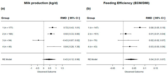 In general, the inclusion of lipid supplements in dairy cow diets resulted in an increase in milk production by 0.480 kg/d compared to the control group (p < 0.001, Table 4). Additionally, we observed a 2.8% improvement in feed efficiency (p < 0.001, Table 4). It is important to note that the milk production showed high heterogeneity (I2 = 79.9%, Table 4). Subgroup analysis revealed that not all diets led to an increase in milk production (Figure 5a). No effects on milk production were observed in cows supplemented with diets rich in UFA (Group 3). Regarding feed efficiency evaluation by subgroup, we found that only diets in Group 1 (characterized by intermediate levels of UFA) improved the feed efficiency of cows (Figure 5b).