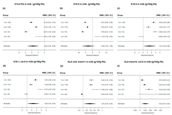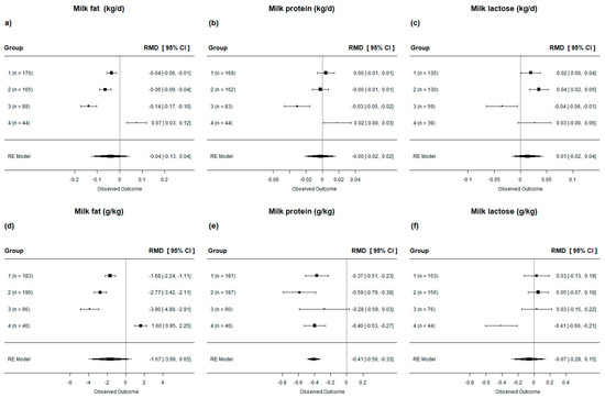 Initially, we investigated the effect size (i.e., RMD) of including lipid supplements into the diets of dairy cows. When medium or high heterogeneity (I2 > 25%) was observed in the overall responses, we conducted subgroup analyses based on the FA profile of the diets. This approach allowed the assessment of the effect of different dietary FA profiles on milk production, milk fat production and proportion, and milk FA profiles.