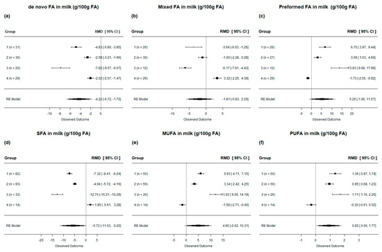 Forest plot of the effect of lipid-supplemented diets on milk fatty acids, according to their biological origin [(a) de novo FA; (b) mixed FA; (c) preformed FA; (d) SFA; (e) MUFA; (f) PUFA], in lactating dairy cows. Diets are grouped by fatty acid profile. The square represents the mean effect size of lipid source group and square size represents the relative weight of the lipid source group in the overall effect size. The lines connected to the squares represent the lower and upper 95% CI for the effect size. The diamond is the overall effect size with a 95% CI. The dotted vertical line represents a mean difference of zero (i.e., no effect), while negative or positive values denote the effect of the lipid source group.
