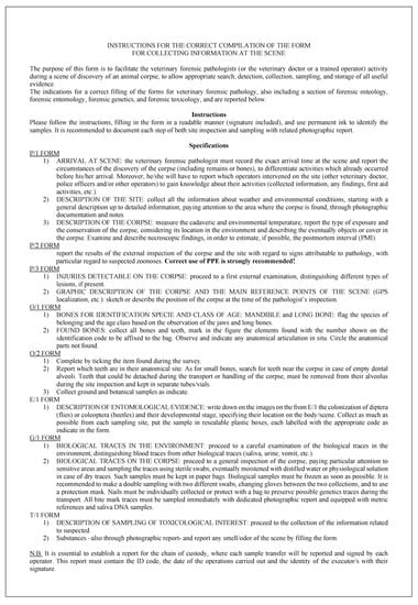 The structure of the cards described below facilitate the veterinary forensic pathologists (or the veterinary doctor or a trained operator) activity during a scene inspection of discovery of an animal dead body, to allow appropriate search, detection, collection, sampling, and storage of all useful evidence. Each sheet reports multiple choices which refer to all the variables that must be observed and have to be specified during the on-site inspection. The operator has only to check the variable of interest and then to fill the relative field/box. Understanding and filling in the card is facilitated and accelerated by body diagrams of a generic mammal and diagrams that are placed at the operator’s disposal. There are also blank frames for additional notes.