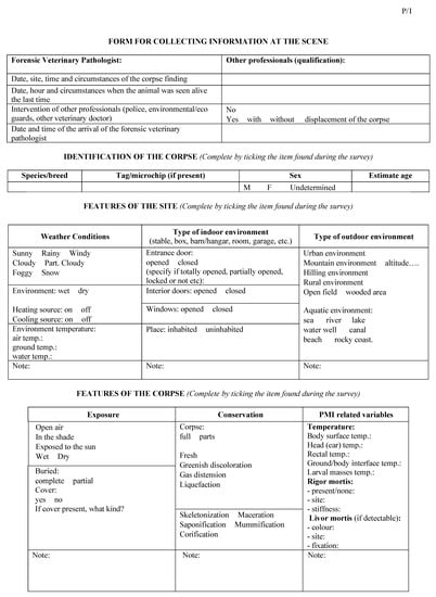 Like the Parma form, the on-site inspection veterinary form here proposed, is composed by different independent sheets (Figure 1): three sheets dedicated to veterinary forensic pathology (P/1, P/2 and P/3), two other focused on osteology (O/1 and O/2), one reserved to entomology (E/1), one to genetics (G/1) and one to toxicology (T/1).