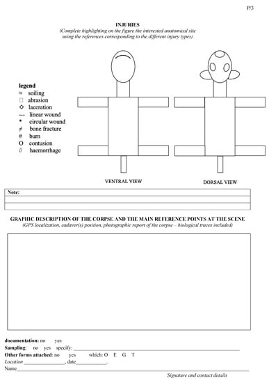 The body diagram on sheet P3 is generic and therefore usable for any terrestrial mammal. On this diagram, the operator marks the location of the soiling or lesions using the symbols listed in the ‘legend’. The last section of P3 sheet reserves an empty space where the location is inserted (GPS localization) also useful for sketch or describe the position of the cadaver at the time of the pathologist’s inspection. The sheet P/3 ends with the annotation of the presence of other forms that must be attached to complete the information intended for each forensic expert.