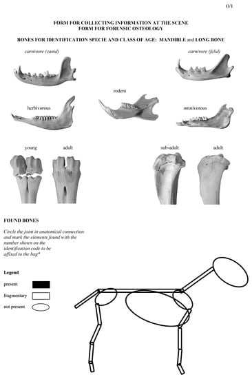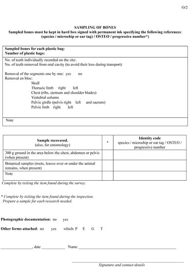 If skeletal remains are present on the scene, sheets O/1 and O/2 are used. The first part of O/1 is dedicated to the recognition of the species based on mandible and dentition. O/1 sheet is also to be used for and to determine the age range based on ossification by choosing from the images of mandibles and long bones proposed in the form. The operator must flag the recognized jaw and thus indicate whether the bony remains belong to a carnivore (canid or felid), a rodent, an herbivore, or an omnivore. Based on the closing of the physis, the operator chooses the appropriate image between young, sub-adult and adult to indicate the age range of the subject. The second part is used to indicate which bony elements and teeth are present and mark any connections that are still detectable. In O/2, the manner in which the bone and teeth is collected, stored and transported is indicated. Small bones should be searched near the cadaver. In the same way teeth should also be sought if empty dental alveoli are observed. Teeth that may come off and be lost during transport or handling of the cadaver should be removed from their alveolus during site inspection and stored in separate tubes/vials. In the last box, the operator finds the information for the collection of the soil under the cadaver and the botanical elements present around it.