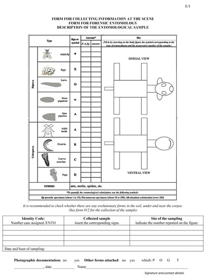 - Cecchi, R.; Cusack, D.; Ludes, B.; Madea, B.; Vieira, D.N.; Keller, E.; Payne-James, J.; Sajantila, A.; Vali, M.; Zoia, R.; et al. European Council of Legal Medicine (ECLM) on-site inspection forms for forensic pathology, anthropology, odontology, genetics, entomology and toxicology for forensic and medico-legal scene and corpse investigation: The Parma form. Int. J. Leg. Med. 2022, 136, 1037–1049. [Google Scholar] [CrossRef]