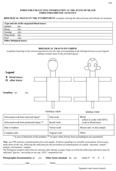 The G/1 sheet should be used when biological traces are found in the environment or on the dead animal body. For the blood traces on the environment, the sheet offers a list of blood patterns traces from which the operator can choose the most appropriate one. Other biological traces (saliva, urine, vomiting, etc.) should be distinguished and pointed out in the appropriate section. A general inspection of the body is carried out for the collection and storage of biological traces on the cadaver. Particular attention is required for the sampling of areas in which there may be biological elements attributable to the aggressor. Feces or hair must be collected although they are not necessarily indicative of the identity of the aggressor. The module indicates how to sample the traces with sterile swabs, possibly moistened with distilled water or saline in case of dry traces. These samples must be air-dried and stored in paper bags. Biological samples must be frozen as soon as possible. The form is completed with the instructions on the procedure to follow during the sampling that must be carried out with a double sampling with two different pads, changing the gloves between the two collections and keeping a protective mask during throughout the procedure. Special instructions are provided for the nails or claws that must be collected individually or protected with a bag to preserve any genetic traces during transport. All traces of bites inflicted on a live animal must be sampled for the attacker’s salivary DNA. The utility of the sample is linked to the operator’s ability to recognize a bite inflicted on a live animal from the signs resulting from a post mortal consumption. The sample sheet for genetics is supplemented by a body pattern of generic mammalian on which symbols corresponding to blood traces and traces of other organic material found on the cadaver may be inserted. The last part lists the samples that must be considered for sampling. The flag of the samples taken is required.