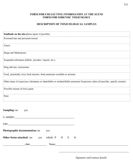 The T/1 sheet is to be used in case of the presence of substances or materials that lead one to suspect the presence of a toxicant at the scene being examined. The operator is guided in the inspection by a suspect of the presence of substances at the site, including biological material (e.g., vomit), or chemicals in the form of powders or liquids, phyto- and agro-pharmaceutical containers or rodenticide devices, drug containers, but also particular odors.
