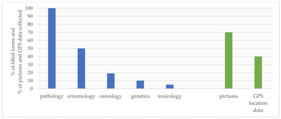 The form was applied to 129 real cases and 11 simulations. In 87 cases the inspection was performed on fresh cadavers and in 20 cases in skeletonized cadavers. Forty-five cases concerned dead animals found on the roadside or in the highway. In 5 cases they were found in urban context (city, garden, etc.). The authors assessed the quality of the compilation of the sheets assessing the completeness and punctuality of completed forms. The GPS location data (GNSS coordinates) has almost always been applied to cases of dead animals found in non-urbanized areas while resulted totally absent in urbanized areas where only the address data has been entered or simply the name of the locality has been indicated. The pathology sheet (P/1, P/2 and P/3) was always completed while the other sheets were compiled only if necessary. In detail, in 100% of the cases the P/1, P/2 and P/3 sheets were filled, in the 50% the E/1 was compiled, in the 19% the O/1, in the 10% the G/1 and in the 5% the T/1. In 70% of the cases pictures were taken (Scheme 1).