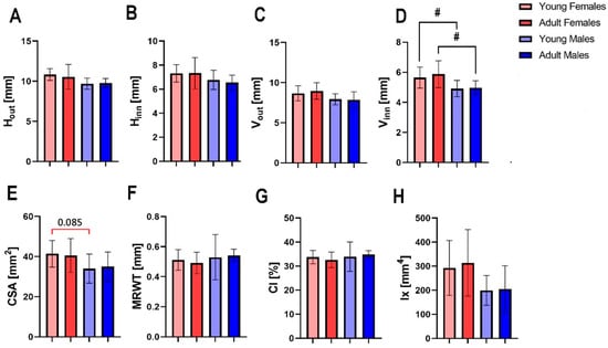 Geometrical properties of bone mid-diaphysis of the femur of young female, adult female, young male and adult male hares: (A) transversal outer diameter (Hout), (B) transversal inner diameter (Hin), (C) anteroposterior outer diameter (Vout), (D) anteroposterior inner diameter (Vin), (E) mid-diaphysis cross-sectional area (CSA), (F) mean relative wall thickness (MRWT), (G) cortical index (CI), (H) cross-sectional moment of inertia (Ix). Hashtags (#) indicate differences between specimens of different sexes at the same age (# p < 0.05), while red bracket indicates a trend towards significance between different groups (p-value between 0.05 and 0.1), where number above bracket indicates exact p-value.