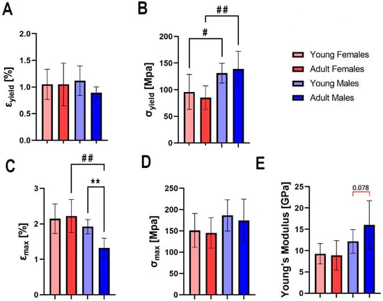 Bone material properties of the femur of young female, adult female, young male, and adult male hares: (A) yield strain (εyield), (B) yield stress (σyield), (C) breaking strain (εmax), (D) breaking stress (σmax), (E) Young’s modulus. Asterisks (*) indicate significant differences between young and old animals of the same sex (** p < 0.01), hashtags (#) indicate differences between specimens of different sexes at the same age (# p < 0.05; ## p < 0.01), and red bracket indicate a trend towards significance between different groups (p-value between 0.05 and 0.1), where number above bracket indicates exact p-value.