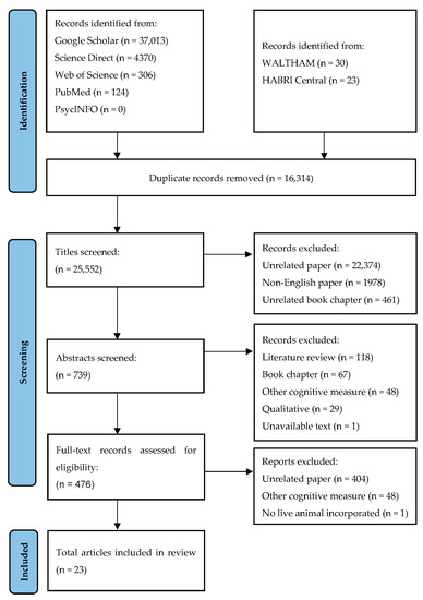 A literature search was conducted using the Preferred Reporting Items for Systematic Reviews and Meta-Analyses (PRISMA) guidelines [45]. Relevant literature was first identified through electronic searches of databases, including Google Scholar, PubMed, Web of Science, Science Direct, and PsycINFO from inception to September 2022. The HABRI Central (habricentral.org/resources) and WALTHAM (waltham.com/resources) websites, which compile research on human–animal relationships, were also searched. The search terms used to collate the literature were ‘animal-assisted intervention’, ‘animal-assisted therapy’, ‘pet’, ‘companion animal’, and ‘human–animal interaction’, in combination with ‘executive function *’, ‘working memory’, ‘inhibit *’, ‘cognitive flexibility’, and ‘attention’.