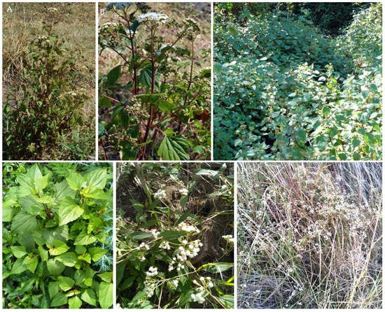 - Crofton Weed. 2022. Available online: https://www.daf.qld.gov.au/__data/assets/pdf_file/0005/74966/crofton-weed.pdf (accessed on 10 June 2023).