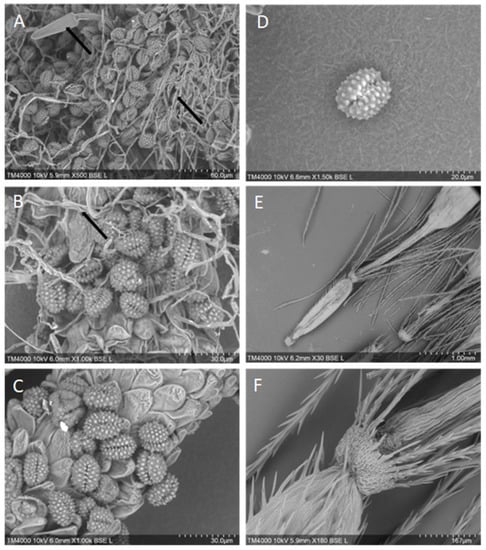 Many of the plants of the family Eupatorium have had their pollen morphology characterized, with 11 of the 192 species exhibiting short-spined pollen typical of plants associated with allergic responses [40,41]. However, the pollen from A. adenophora and A. riparia has not been characterized by a Scanning Electron Microscopy (SEM). The Environmental Analysis Laboratory at Southern Cross University, Lismore, was contracted by the authors to perform SEM of A. adenophora and A. riparia pollen samples collected from Bentley, Northern NSW. Twelve pollen samples from A. adenophora and A. riparia were prepared via desiccation, attachment to SEM stubs, and examined under a low vacuum. A Hitachi TM4000 desktop SEM was used to evaluate and record the images. No differences between the Crofton weed and the Mist weed pollen were noted, with both being spherical to ovoid and with one colpi. Pollen ranged from 15–22 µm in size, with continuous spikes across the surface (Figure 2A–D). The barbellate achenes (seed capsules: ~1–2 mm) had sharp barbs across the surface of the seed and papillae (Figure 2E,F), and all the samples contained fungal hyphae that were intertwined with the reproductive structures (Figure 2A,B).