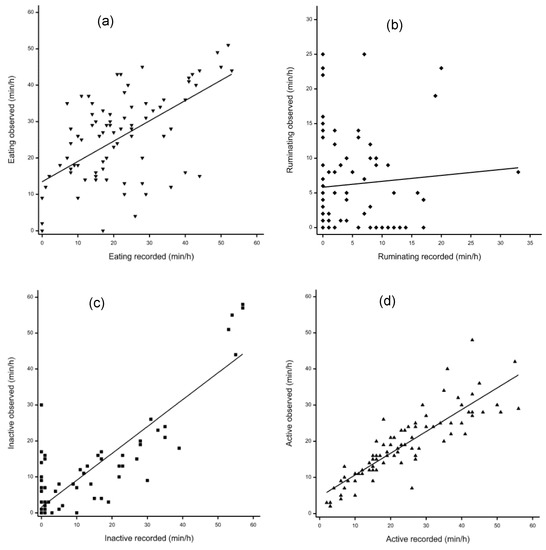 Relationship between CowManager SensOor recordings and visual observation. (a) Eating duration (⯆); (b) ruminating duration (⯁); (c) inactive duration (⯀); (d) active duration (⯅).