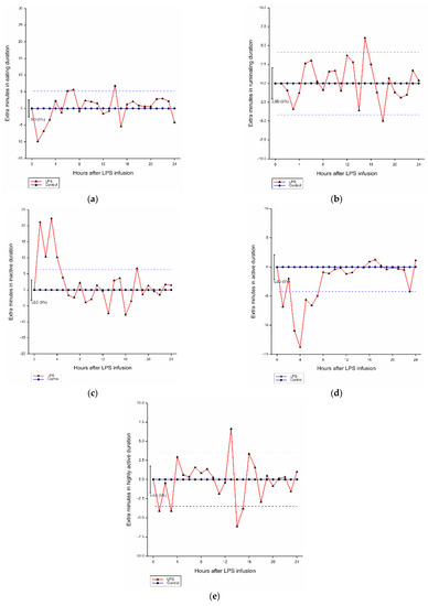 There were significant effects of hour (p < 0.001) and LPS infusion by hour interaction (p < 0.001) on highly active duration in comparison with the control group (Figure 2e). LPS infusion increased the highly active duration of affected within 3 h by 2.90 min/h.