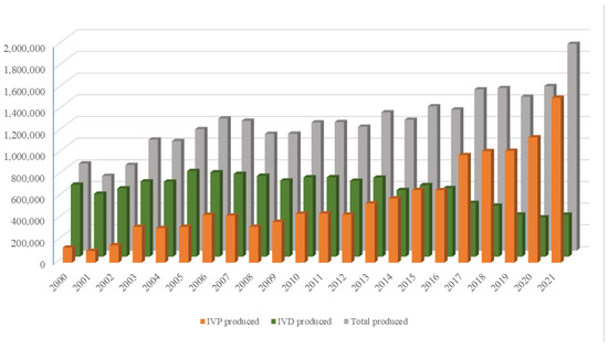Annual production of IVP (orange bars), IVD (green bars), and total number (gray bars) of bovine embryos. Compiled from 2001–2022 annual Data Retrieval Committee Reports of the International Embryo Transfer Society.