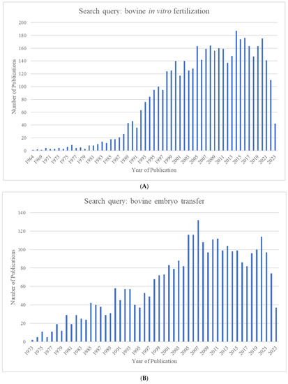 The growing world population has created an ever-increasing demand for animal proteins. The beef and dairy industries play tremendous roles in this regard, annually contributing >72 million metric tons of meat (21% of global meat production) and >500 million metric tons of milk to the global market. Reproduction is a major driver of the bovine meat and milk production industries. As such, Assisted Reproductive Technologies (ARTs) such as in vitro embryo production (IVP), in vivo derived embryo production (IVD), and embryo transfer (ET) have gained enormous importance in the beef and dairy cattle industries [1]. As illustrated in Figure 1, the annual production of transferrable bovine embryos has nearly doubled within the 12-year period from 2009 to 2021. What is even more striking is the shift of embryo production from IVD to IVP, with embryo production by IVP quadrupling over the same period. In 2021, over 1.5 million transferrable IVP embryos were produced (Figure 1), of which nearly 80% (~1.2 million) were transferred [2]. Parallel to this rapid expansion of IVP, the interest from the scientific community and, in turn, research publications have also risen many-fold over the last few decades (Figure 2A–C).