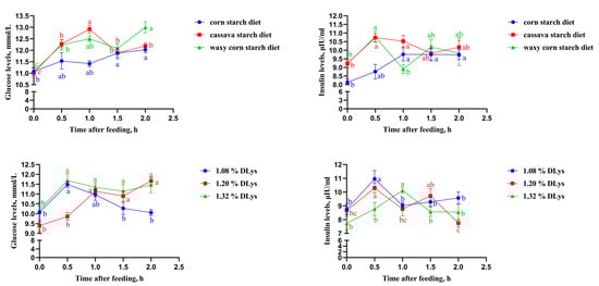 Effects of different starch sources and dLys levels on glucose and insulin responses in broiler chickens 2 h after feeding. a,b,c Means in the same color with different superscripts indicate differences or significant differences (p < 0.05).