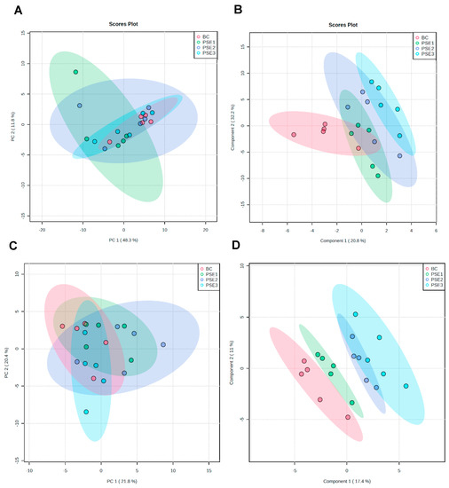 PCA and PLS–DA were initially carried out to visualize the overall alterations of all serum and gut metabolites in the different groups, respectively (Figure 1). The PCA score plot shows principal components 1 and 2 (PC1 and PC2). As described in Figure 1A,C, the unsupervised PCA scores plot based on serum and gut metabolites explained almost 60.1% (48.3% PC1 and 11.8% PC2) and 42.2% (21.8% PC1 and 20.4% PC2) of data variability, respectively. Further, supervised PLS-DA observed that there was a partial overlap of the levels of serum metabolites between groups (Figure 1B). However, there were evidently different trends in the levels of the gut metabolites among groups, which reflected the remarkably distinct metabolic status, with the exception of the PSE2 group versus the PSE3 group (Figure 1D).