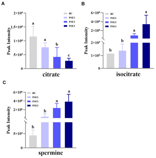 Histogram analysis of the detected differential metabolites in the intestinal content of growing chickens at 35 d of age from each treatment. Results are means ± standard deviation of the mean (n = 5). BC: chickens fed with a basal diet; PSE1, PSE2, PSE3: chickens fed with the same basal diet supplemented with 100, 200, and 300 mg/kg of PSE, respectively. (A) Peak intensity of citrate in the metabolomics analysis; (B) Peak intensity of isocitrate in the metabolomics analysis; (C) Peak intensity of spermine in the metabolomics analysis; different superscript lowercase letters in each bar represent significant differences.